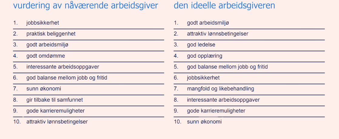 Her har Ranstad sendt en undersøkelse til 3000 norske arbeidstakere for å finne ut av hva som er viktig for norske arbeidstakere hos sin nåværende arbeidsgiver vs. den ideelle arbeidsgiveren. Under ser du at flere av punktene faller sammen med mangfoldsarbeidet.