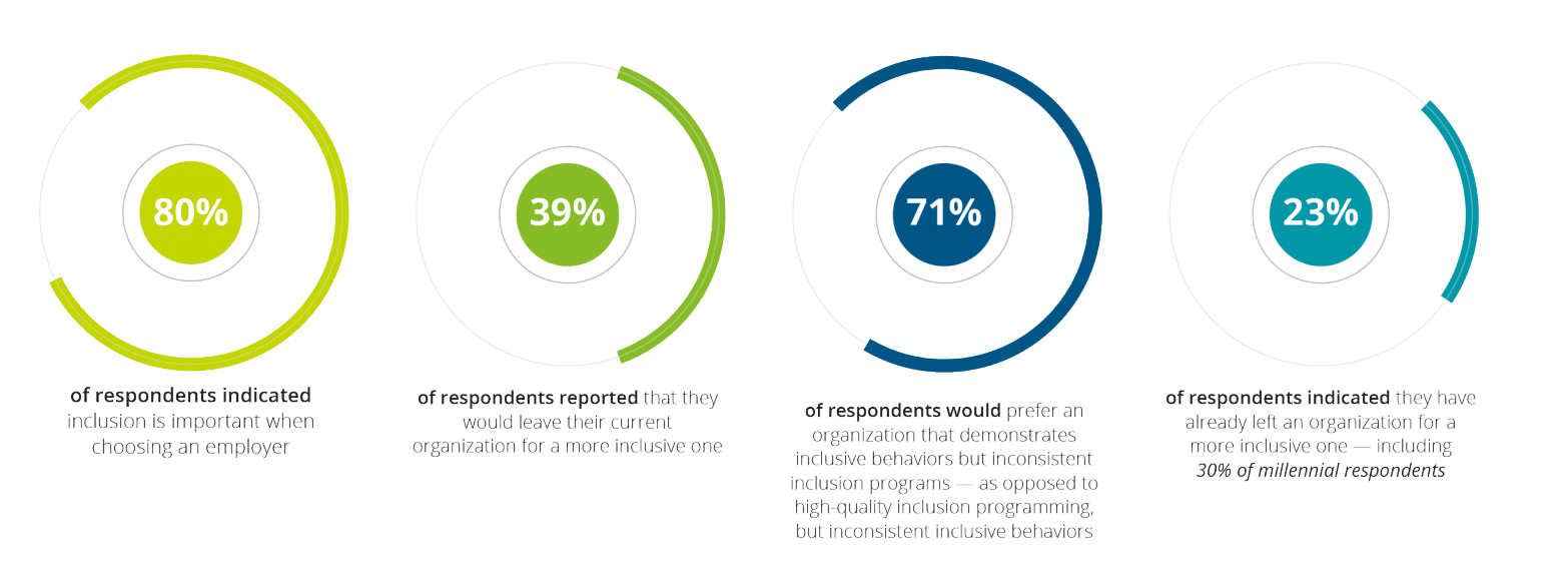 I denne undersøkelsen ser Deloitte på hvordan inkludering og turnover henger sammen. På bildet under ser du at 39% sier at de ville forlatt sin nåværende arbeidsgiver for en mer inkluderende arbeidsplass. Videre sier 23% at de allerede har forlatt arbeidsplassen, for en mer inkluderende. Så, hvordan henger dette sammen med lønnsomhet? Jo, fordi det koster mye å erstatte en ansatt. Ved å ha en inkluderende kultur kan du derfor bidra til lønnsomhet.