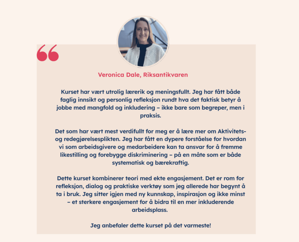 Når du har fullført kurset, vil du ha konkrete verktøy og kunnskap til å lede mangfoldsarbeidet i virksomheten din. Du vil kunne: